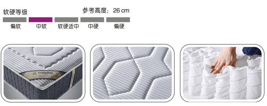 | 1. 采用6D条纹网纱透气面,独特的裥花工艺,给你带来更舒适的健康享受; 2. 3分天然乳胶,手工天然采集,入睡时伴有淡淡的奶香味,平滑透气,具有防螨防蛀、不易变形、经久耐用等特点,其丰富的回弹力,为您的睡眠带来更多舒适睡感; 3. 4分有氧健康环保棉,天然抗菌、抑菌、防螨、防臭和抗紫外线;超强透气、透水功能,可有效防止风湿病; 4. 开放式独立袋装弹簧,以极佳的支撑力及衬托力来适应睡眠者的不同睡姿,解除因睡眠而造成的腰酸及不易入睡等问题;足以给睡眠者腰部足够的支撑; 5. PK棉,是床垫生产领域中最理想最高档垫芯包裹材料之一。特点是纯白无杂质、透气防水、无菌无甲醛无苯、回弹性超强、纵横拉力超强、轻盈等。 |