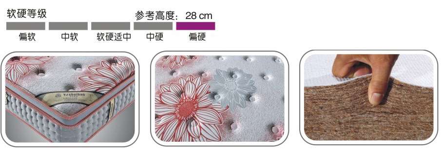 2. 采用高密度7分环保棕,棕丝通过多道梳理工序脱糖脱水剔除渣物,有效把椰丝彻底清除均匀平铺形成棕板,经过高温压成,穿透处理,防霉透气,减震吸汗,保护脊椎,能有效地改善人体脊椎的各种问题;